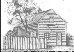 The picture reproduced above right is a drawing of the Meeting House when it served as a post office following several years as a blacksmith shop. This becomes evident by observing in the picture the letter slot in the door (i.e. post office) and the well worn chimney top (i.e. blacksmith furnace heat) remembering that this Meeting House, on its original location, had no means of heating. Subsequent paintings of the structure apparently used this drawing as an example, placing the slot in the door, worn chimney at roof ridge and showing the drooping clapboard siding on the front.