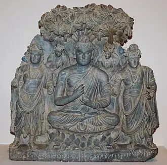 The Brussels Buddha is a famous Buddha statue from the Greco-Buddhist art of Gandhara.[1] It is named after the first collection to which it belonged, the Claude de Marteau collection in Brussels, Belgium, although it is now in a private collection in Japan, belonging to the Agonshū sect of Buddhism.[1] The Brussels Buddha belongs to the category of the "Seated Buddha triads", which can be seen contemporaneously in the Greco-Buddhist art of Gandhara and in the art of Mathura in the early Kushan period.[2] The precise location where the statue was discovered is unknown, but it was acquired in Peshawar, and it is thought to have been excavated in Sahri Bahlol due to its similarity with a statue from the same location, now in the Peshawar Museum.[3]