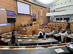 The hemicycle is on the top floor of the building, with the roof being of modern zinc and glass design. The chamber is encircled by a long curved wooden wall and there is an overhanging press and public gallery. Committee rooms have likewise been updated with modern technology but much of the building remains neoclassical. There is also a cafeteria and reading room for deputies. The four rear wings have administrative functions, including housing the President's offices. There is also 400 m2 (4,300 sq ft) of hanging gardens extending to heights of up to 27 metres (89 ft).[1]