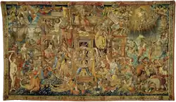 Other leading Brussels ateliers of the 17th century were directed by Martin Reymbouts and members of the Leyniers family. Rubens's pupil Jacob Jordaens also provided many cartoons for tapestries.[32] Kermesse subjects drawn from village life in the manner of the Teniers, father and son, were often woven at Brussels in the 17th and 18th centuries.[33]