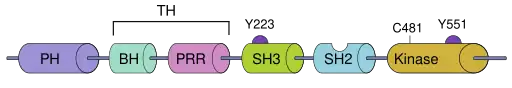 BTK contains five different protein interaction domains. These domains include an amino terminal pleckstrin homology (PH) domain, a proline-rich TEC homology (TH) domain, SRC homology (SH) domains SH2 and SH3, as well as a protein kinase domain with tyrosine phosphorylation activity.[5]