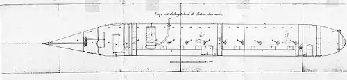 The submarine was 10 feet, 6 inches long by 27 inches high by 25 inches wide and displaced about six tons when submerged.[1] She was equipped with eight dead-lights on top to provide interior light, and a top hatch with a retractable conning tower for surface navigation. For propulsion, she had three sets of duck-foot paddles and a large rudder. She was also equipped with hatches with leather seals in order to make possible some manipulations outside the hull, a small ballast system with a lever and piston, and a 50 lb anchor. The ship had a complement of three men.