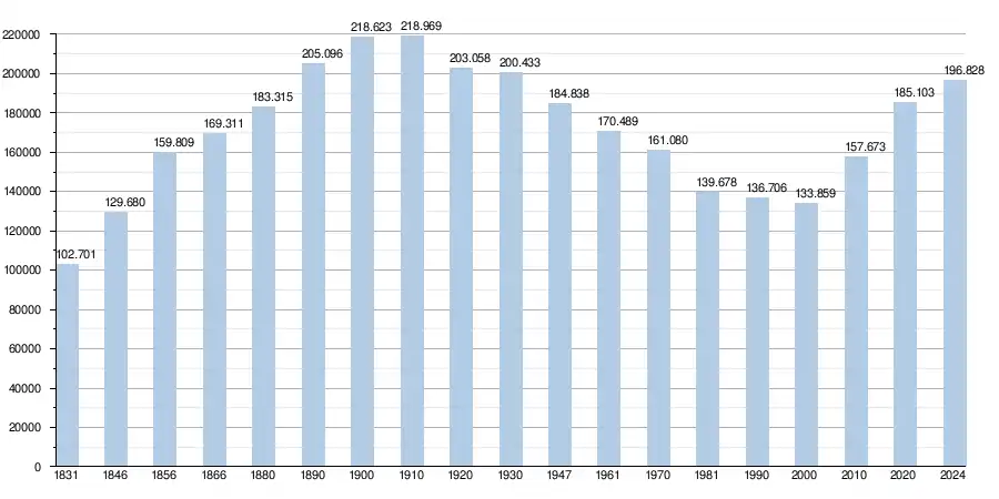 As of 1 January 2024, the City of Brussels' population was 196,828 inhabitants.[5] The area is 33.09 km2 (12.78 sq mi), making the density 5,949/km2 (15,410/sq mi).[5]