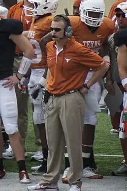 After the 2010 season, Harsin moved to the University of Texas in Austin for the 2011 and 2012 seasons and was the primary play-caller for the Longhorns, paired with Major Applewhite as co-offensive coordinators.[9] During this time he also served as quarterbacks coach for the Longhorns.[10]