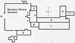 The D'Evercy family were responsible for building the almost adjoining church. Christopher Hussey suggests[2] that the D'Evercy's manor at Brympton was little more than an unostentatious range of buildings on the site of that part of the present staircase wing (marked K on plan), with an adjoining farmyard to the north of it. The remains of a farm exist on the probable site of the D'Evercy's farm today, and an old farmhouse (marked P on plan) adjoins the much later south wing built on the probable site of the original manor. Thomas d'Evercy purchased the estate in 1220 from the Chilterne family (of whom nothing is known). The d'Evercy family derived their name from Evrecy, a village near Caen in Normandy. Thomas d'Evercy was part of the retinue of the Norman Earl of Devon, which is the reason he left the family estates on the Isle of Wight to reside in Somerset. D'Evercy represented Somerset and South Hampshire at the first Parliament of England. Following Thomas d'Evercy's death, family records are scarce until the time of the last d'Evercy, Sir Peter, who twice represented Somerset in Parliament, under Edward II. The church next to the house, St Andrew's, dates from this period. Sir Peter founded a chantry at Brympton d'Evercy in 1306, endowing a priest with a messuage and 40 acres (160,000 m2) in the parish. It has been suggested that this is the building today known as the Priest House, but no structural evidence exists to support this claim.[15] Sir Peter died in 1325, when the estate was described as "a certain capital messuage, with gardens and closes adjoining".[16] The village at the time contained 17 smallholders and three tenant farmers. Sir Peter's widow remained in occupation, and on her death the estate passed to the Glamorgan family, the d'Evercy's daughter Amice having married John de Glamorgan. Later it seems to have passed through obscure descent to the Wynford family, of whom nothing other than their names is recorded. In 1343 the estate was recorded as "a manor house sufficiently built with a certain garden adjoining planted with divers and many apple trees, the whole covering some two acres." The record goes on to record some forty householders all charged to serve their lord as "village blacksmith, drover or domestic servant".[17] This was the highest population the village was to have until the late 20th century.