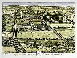 The south wing, which finally gave the mansion its present appearance, is no better documented than the rest of the house. Opinion on the exact date of construction of the wing is divided ("L" on plan) between 1670 and 1680, with some suggesting it had been started as early as 1636 or the early years of the Restoration of 1660.[11] Dating the wing is essential to identifying the architect: the south wing, if considered to date from the 1630s, was often attributed to Inigo Jones – many English houses make this claim, some like Wilton House with more plausibility than others[12] – until Christopher Hussey debunked the myth in 1927, largely based on the assumption that the south wing was completed in 1680, when Jones would have been dead for 20 years.[13][14] The most noticeable similarity between Jones's documented work and Brympton d'Evercy is the use of alternating triangular and segmental window pediments, but Jones only ever used this motif to give importance to the windows of the piano nobile, for at Brympton d'Evercy the alternating pediments give both floors equal value. The piano nobile at Brympton is most unusual in being on the ground floor. It is doubtful that a master architect who had designed for the royal family, and the highest echelons of the aristocracy, would have considered such a placing. Also typical of Jones, but a common feature of the time, is the balustrade parapet hiding a hipped roof. However, the greatest architectural clues that suggest Jones had no hand in the design of the mansion are basic ones: the architect of Brympton d'Evercy gave the façade 10 bays, which means the windows begin with a segmental pediment and end with a triangular one, and no master architect would have permitted such an affront to balance. Finally, as the house is of ten bays, it has no central focus: this is not an architectural crime, but what is such is that the South front in its centre has a focal point: a drain pipe sited there since the building's completion. The evidence would suggest that the South facade was inspired by Hinton House, at nearby Hinton St George, the childhood home of Sir John Posthumous Sydenham's wife, completed in 1638. These two houses, along with Long Ashton House, were probably designed and built by the same local family of architects and masons, working from drawings by Serlio's treatise on architecture, which had been published in five volumes in London in 1611.