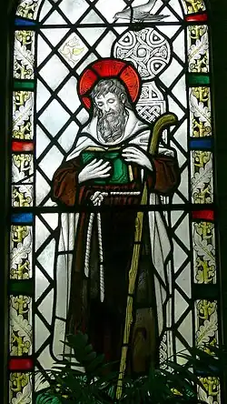 Our Lady and Saint Non's chapel (St Davids, Wales). Stained glass window (1934) showing Saint Brynach.