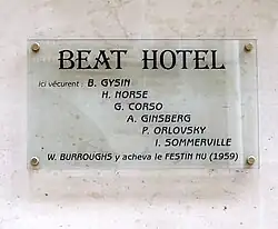 In 1954 in Tangier, Gysin opened a restaurant called The 1001 Nights, with his friend Mohamed Hamri, who was the cook.[7]: 140 Gysin hired the Master Musicians of Jajouka from the village of Jajouka to perform alongside entertainment that included acrobats, a dancing boy and fire eaters.[8][9] The musicians performed there for an international clientele that included William S. Burroughs. Gysin lost the business in 1958,[10] and the restaurant closed permanently. That same year, Gysin returned to Paris, taking lodgings in a flophouse located at 9 rue Gît-le-Cœur that would become famous as the Beat Hotel. Working on a drawing, he discovered a Dada technique by accident: