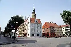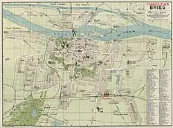 During World War II, the Germans operated two Nazi prisons with three forced labour subcamps in the town and a fourth subcamp in Bielawa.[24][25] In early 1945, some prisoners were sent on a death march to Kłodzko.[26] 202 Polish citizens were murdered by Nazi Germany in the town during the war.[27] During the war, 60% of Brieg was destroyed and many of the town's inhabitants died during the severe winter of 1944–5 as they fled from the advancing Red Army. The war had brought the most severe destruction to the town in its entire history. Some of the town's population was evacuated by the German Army who moved its population further west inside Germany for safety and declared Brieg a fortress. After the fall of the town to the Soviets the remaining German population were later expelled in accordance with the Potsdam Agreement. The town, under the historic Polish name Brzeg became again part of Poland and was repopulated by Poles whom Soviets expelled from the eastern part of interwar Poland.