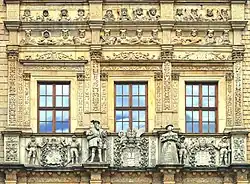 The town continued to flourish under the reign of Duke George II. George II maintained close contacts with the Polish–Lithuanian Commonwealth and its nobility, and rebuilt the Ducal Castle in Renaissance style, built the Renaissance town hall, established a new mausoleum of the Piast dukes and built a new gymnasium, opened in 1569.[19] The libraries of the old schools were merged into the newly named Piast Library.[20] The gymnasium became popular among Polish nobility, whose children were often educated there.[21] Among the graduates were Polish Royal secretary and poet Joachim Bielski and reformer Samuel Hartlib, co-founder of the Royal Society of London.[22]