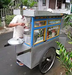 The origin of bubur ayam was derived from Chinese chicken congee. The traces of Chinese cuisine influences are the use of cakwe (youtiao), tongcay or chai poh and soy sauce.[3] Bubur ayam employs a wide range of poultry products, such as shredded chicken meat for the main dish and many other dishes made with chicken offal as side delicacies. Bubur ayam is often eaten with the addition of boiled chicken egg, chicken liver, gizzard, intestines and uritan (premature chicken eggs acquired from butchered hens), served as satay. There are some variants of bubur ayam, such as bubur ayam Bandung and bubur ayam Sukabumi, both from West Java.[4] The later variant uses raw telur ayam kampung (lit. "village chicken egg", i.e. free-range eggs) buried under the hot rice congee to allow the egg to be half-cooked, with the other ingredients on top of the rice congee.[5] The recipe and condiments of bubur ayam served by travelling vendors and warung are also slightly different with those served in fast food establishments or hotel restaurants.