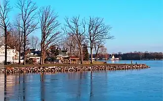 As early as the 1750s, the area that would become Buckeye Lake was described as a great swamp known as "Buffalo Lick". The main Indian trails between the Ohio River and the Miami towns passed by this swamp.[2] Construction of a dike to block the South Fork of the Licking River occurred between 1826 and 1830, to provide a source of water for the Ohio and Erie Canal.[3]
