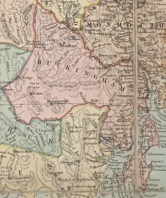 The County of Buckingham, bounded on the north by the river Derwent from its confluence with river Florentine to the sea; on the west by the river Florentine to its source, and thence by a line to the source of the river Huon, and by that river to the sea. This county to include Bruni island, the Egg islands, Huon island, Garden island, Partridge island, Penguin island, Satellite island, Green island, Snake island, Arch island, Actaeon island, and all other islands in D'Entrecasteaux channel.[3]