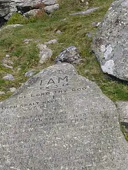 He celebrated by engaging Mr W A Clements, a stonemason from Exeter, to engrave granite stones in situ on Buckland Beacon with the Ten Commandments. He started work on 15 December 1927 and completed the job on 14 June 1928. Whilst engraving the stones he lived in a cow shed on the site and was supplied each week with a loaf of bread by Mr Whitley.