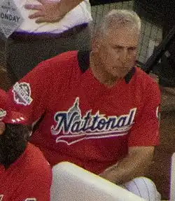 In October 2006, Brian Sabean, general manager of the Giants, interviewed Black for the Giants' vacant managerial position.[21] After the position went to Padres manager Bruce Bochy, Black became a candidate for the Padres job, and was officially hired on November 8, 2006. Despite a last-place finish for the Padres in 2008, Black returned to finish his contract in 2009. During the 2009 season, Black was given a contract extension for the 2010 season with a club option for 2011. During the 2010 season, the Padres gave Black another three-year extension through 2013, with club options in 2014 and 2015.[22] In 2010, Black presided over the worst collapse in Padres history when they went on a ten-game losing streak with a little over a month left in the season, went 12–16 in September and squandered a 6+1⁄2-game lead over the Giants for the NL West title. Black nonetheless was the winner of the 2010 National League Manager of the Year Award, edging Dusty Baker of the Cincinnati Reds in voting by a single point.[23] Black is only the third former full-time pitcher to win a Manager of the Year Award, joining Tommy Lasorda and Larry Dierker.