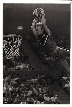 In 1980, Ty Cobb, along with fellow cheerleaders Sam Martin, John White, and Jeff Hubbard (as Ole Miss Rebels mascot Colonel Reb) began performing ball handling skits and acrobatics which incorporated a mini-trampoline during the time-outs and half-time of Ole Miss basketball games. Using his previous trampoline and diving skills and the cheerleader's mini-trampoline, Ty Cobb, on a dare performed the first successful acrobatic "flip dunk" at the Ole Miss vs. Alabama basketball game in 1980 and received a standing ovation by Alabama fans. Ole Miss Head Basketball Coach Bob Weltlich, recognizing the group's potential to soften up an opposing team's crowd, began flying the foursome with the Ole Miss Basketball team to away games.