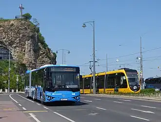 Volvo 7700: Polish made, built in 2004. BKV bought 38 used Volvo 7700 vehicles from Veldhoven in 2012 to replace Ikarus 412's in the hilly routes of Buda, where they ran unreliably. (The 412's were reassigned to generally flatter areas in Pest.) These Volvos finally entered service in early 2013 and are painted in a light shade of blue officially termed "sky blue". They are equipped with automatic climate control.A Modulo M168d articulated bus on route 7 and a CAF Urbos 3 tram on route 19 at St. Gellért's SquareVolvo 7700A: Polish made, built specifically for Budapest, 17.9 meters (58.7 ft) long articulated buses, based on Swedish B7LA chassis. Considered a technological marvel by experts for cramming four double doors and a usable gangway into a fully low-floor vehicle with vertically mounted engine. Current fleet of 81 arrived in three batches of fifty in 2004/2005/2006. Some passengers do not like them because of the cramped standing areas (low floor design causes slimmer standing areas), and slower run times (due to poor road conditions, especially on route 7). During their service years, they have become liked vehicles because of their higher comfort level and quietness. All of them have automatic climate control, (the first 50 was equipped with it later), which was unique to BKV's bus fleet at the time of their arrival.