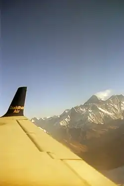 Buddha Air Pvt. Ltd (Nepali: बुद्ध एयर) is an airline based in Lalitpur, Nepal.[5][6] It operates domestic flights within Nepal as well as international services to Varanasi, India, from its main base in Tribhuvan International Airport, Kathmandu.[7][8] It was the largest domestic carrier in terms of passengers carried in 2023.[9] It is currently on the list of airlines banned in the European Union like all other airlines in Nepal.[10]