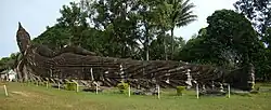 The statues are made of reinforced concrete and are ornate in design.[5] They appear to be centuries old, though they are not. There are sculptures of humans, gods, animals, and demons.[4] There are numerous sculptures of Buddha, characters of Buddhist beliefs like Avalokiteśvara, and characters from Hindu lore, including Shiva, Vishnu, and Arjuna.[2] The sculptures were presumably cast by unskilled workers under the supervision of Sulilat.[2] One notable sculpture resembles a giant pumpkin.[1] It has three stories, representing three levels of existence: hell, Earth, and heaven.[1] Visitors can enter through an opening, which is the mouth of a 3-metre-tall demon head (9.8 ft), and climb several staircases from hell to heaven;[4] each story contains sculptures depicting the respective level. At the top, there is a vantage point, from which the entire park is visible.[4] Another sculpture, an enormous 40-metre-long (130 ft) reclining Buddha, forms the centerpiece attraction of the park.[6]