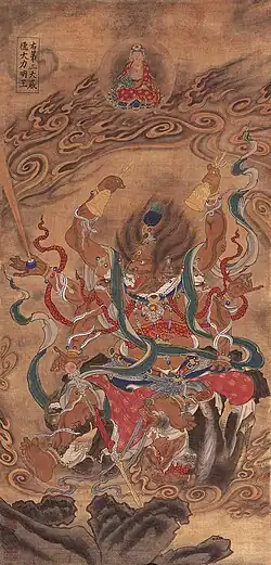 After the Tang dynasty, Buddhism continued to receive official patronage in several states during the Five Dynasties and Ten Kingdoms period, which continued under the successive Liao, Jin, Song, Yuan and Ming dynasties. This was marked by construction of new monumental Buddhist artwork at grottoes, such as the massive Buddha sculptures at the Dazu Rock Carvings in Sichuan province, as well as at temples, such as the giant esoteric statues of the Bodhisattva Guanyin in Longxing Temple and Dule Temple.[12][13][14] The various Chinese Buddhist traditions, such as Tiantai and Huayan, experienced revivals. Chan Buddhism, in particular, rose to great prominence under the Song dynasty. Early paintings by Chan monks tended to eschew the meticulous realism of Gongbi painting in favour of vigorous, monochrome paintings, attempting to express the impact of enlightenment through their brushwork.[15] The rise of Neo-Confucianism under Zhu Xi in the twelfth century resulted in considerable criticism of the monk-painters by the literati. Despite this, Chan ink paintings continued to be practiced by monastics through the Yuan (1271–1368) and Ming (1368–1644) dynasties well into the Qing (1644–1912) dynasty.[16][17][18] Aside from Chan ink paintings, other forms of painting also proliferated, especially during the Ming dynasty, such as the Shuilu ritual paintings and mural art which depict various Buddhist divinities and other figures.[19]