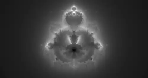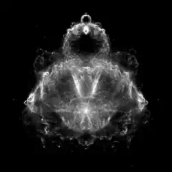 The Buddhabrot is the probability distribution over the trajectories of points that escape the Mandelbrot fractal. Its name reflects its pareidolic resemblance to classical depictions of Gautama Buddha, seated in a meditation pose with a forehead mark (tika), a traditional oval crown (ushnisha), and ringlet of hair.