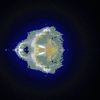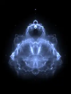 Green later realized that this provided a natural way to create color Buddhabrot images by taking three such grayscale images, differing only by the maximum number of iterations used, and combining them into a single color image using the same method used by astronomers to create false color images of nebula and other celestial objects. For example, one could assign a 2,000 max iteration image to the red channel, a 200 max iteration image to the green channel, and a 20 max iteration image to the blue channel of an image in an RGB color space. Some have labelled Buddhabrot images using this technique Nebulabrots.