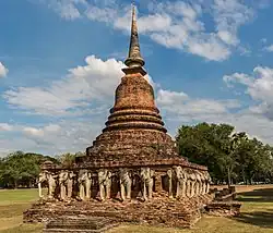 King Ram Khamhaeng (fl. late 13th century) gave royal support to the Lankavong Theravāda monks in Nakon Sri Thammarath. He invited them to his capital, built monasteries for them, and subsequently sent more monks to Sri Lanka to study.[27][28][26] This royal support increased the prestige and influence of Theravāda in Thailand.[8] During Ram Khamhaeng's reign, stupas were built, reflecting the Sri Lankan influence. One of these is Wat Chang Lom.[28] Thai travelers to Sri Lanka also brought back the root of a Bodhi tree, under which the Buddha attained enlightenment, which began the Thai tradition of venerating Bodhi trees. Sukhothai style Buddha statues also reflect Sri Lankan art styles.[29]