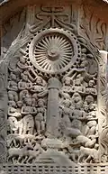 ![]() Stupa No. 2 Shunga period, but mason's marks in Kharoshti point to craftsmen from the north-west (region of Gandhara) for the earliest reliefs (circa 115 BCE).[27][28][23] |