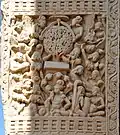 Although made of stone, the torana gateways were carved and constructed in the manner of wood and the gateways were covered with narrative sculptures. It has also been suggested that the stone reliefs were made by ivory carvers from nearby Vidisha, and an inscription on the Southern Gateway of the Great Stupa ("The Worship of the Bodhisattva's hair") was dedicated by the Guild of Ivory Carvers of Vidisha.[41][42]