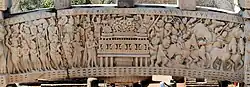 The decorations of Stupa No. 2 have been called "the oldest extensive stupa decoration in existence",[29] and this Stupa is considered as the birthplace of Jataka illustrations.[30] The reliefs at Stupa No.2 bear mason marks in Kharoshthi, as opposed to the local Brahmi script.[27] This seems to imply that foreign workers from the north-west (from the region of Gandhara, where Kharoshthi was the current script) were responsible for the motifs and figures that can be found on the railings of the stupa.[27] Foreigners from Gandhara are otherwise known to have visited the region around the same time: in 115 BCE, the embassy of Heliodorus from Indo-Greek king Antialkidas to the court of the Sungas king Bhagabhadra in nearby Vidisha is recorded, in which Heliodorus established the Heliodorus pillar in a dedication to Vāsudeva. This would indicate that relations had improved at that time, and that people traveled between the two realms.[32]