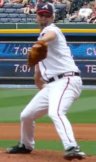 On July 6, 2007, against the Padres, Carlyle tied his career-high with seven strikeouts, set a new career-high with eight innings pitched, and collected his first major league RBI which gave the Braves a 3–2 lead they would not relinquish.[9] In the fourth inning of that game, Carlyle threw an immaculate inning by striking out the side on nine total pitches; it was the 40th time in major-league history that the feat had been accomplished.[10] Reflecting on Carlyle's performance, then Braves manager Bobby Cox noted that "[Carlyle's] sneaky quick. A lot of guys don't have good hacks at him. He gets it by them."[11] He finished his best season with an 8–7 record and a 5.21 ERA.