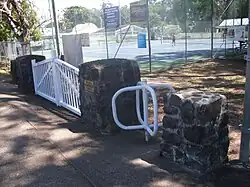 In July 1953 memorial gates were added to the entry of the memorial sports ground on Main Street. The gates formalised the entrance and consisted of four low bluestone pillars with decorative timber gates, turnstile, and a plaque with the inscription "We Will Remember Them". The official unveiling was held on 3 July 1953 with visiting dignitary, Hon. Josiah Francis, Minister for the Army, opening the gates. All materials for the memorial gates were donated by locals.[60][61][62][1]