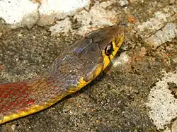 The buff striped keelback (Amphiesma stolatum) is a species of nonvenomous colubrid snake found across Asia. It is a typically non-aggressive snake that feeds on frogs and toads. It belongs to the subfamily Natricinae, and is closely related to water snakes and grass snakes. It resembles an Asian version of the American garter snake.[3] It is quite a common snake but is rarely seen.[4]