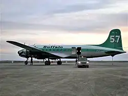 Reports show that Buffalo owns a Douglas DC-6, a Swingtail DC-6, and the only one of the two made that still survives. It was bought by Buffalo Airways[37][38][39] and ferried to Hay River on 20 June 2013[40] As of August 2019 the aircraft has not been registered in Canada - (formerly N434TA) - stored Hay River.