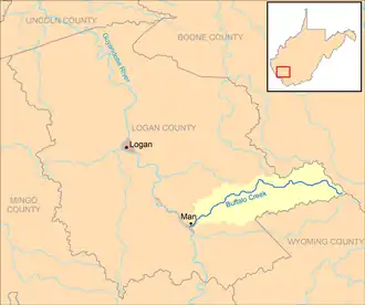 Buffalo Creek is a tributary of the Guyandotte River, 18.8 miles (30.3 km) long,[3] in southern West Virginia in the United States. Via the Guyandotte and Ohio rivers, it is part of the watershed of the Mississippi River, draining an area of 45 square miles (120 km2)[4] in the Logan Coalfield. The creek was the site of the Buffalo Creek Flood in 1972.