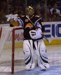 The following season, on November 13, 2013, the team dismissed general manager Darcy Regier and head coach Ron Rolston.[178] Former Sabres head coach Ted Nolan was named interim head coach for the remainder of the season. He later signed a three-year contract extension. Pat LaFontaine was named president of hockey operations.[178] On January 9, 2014, Tim Murray, the assistant general manager of the Ottawa Senators, was named general manager.[179] On February 28, 2014, Murray made his first major trade, sending star goaltender Ryan Miller and captain Steve Ott to the St. Louis Blues in exchange for goaltender Jaroslav Halak, forwards Chris Stewart and William Carrier and two draft picks.[180] After just over three months as president of hockey operations, Pat LaFontaine resigned from the Sabres to return to his previous position with the NHL on March 1, 2014.[181] Among highlights in the otherwise bad 2013–14 season included the "butt goal" in which a severely short-staffed Sabres won their December 23 contest against the Phoenix Coyotes when Coyotes goaltender Mike Smith backed into his own goal with the puck lodged in his pants,[182] and the lone NHL appearance of former Lancaster High School goaltender Ryan Vinz, who was working as a videographer in the Sabres organization, to suit up as a backup goaltender in the wake of the Ryan Miller trade.[183] The Sabres finished the 2013–14 season last in the NHL and again missed the playoffs.[184]