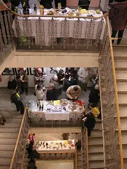 At balls, the "buffet" was also where drinks were obtained, either by circulating footmen supplying orders from guests, but often by the male guests. During the Victorian period, it became usual for guests to have to eat standing up. In fact John Conrade Cooke's cookbook Cookery and Confectionery, (London: 1824) says it was already "the present fashion".[2] In a report on a ball in 1904, a departure from "the usual stand-up buffet supper", with parties being able to reserve tables, was praised.[3]