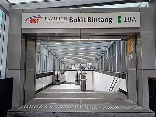 The Bukit Bintang MRT station, otherwise known as Pavilion Kuala Lumpur–Bukit Bintang MRT station due to sponsorship reasons, (working name: Bukit Bintang Station) is a Mass Rapid Transit (MRT) underground station in Kuala Lumpur, Malaysia. Construction started around 2012 and opened on 17 July 2017. It served as one of the stations on the Klang Valley Mass Rapid Transit (KVMRT) Kajang Line, formerly known as Sungai Buloh–Kajang Line. The station has 5 walkways and entrances that are connected to iconic buildings and malls in the Bukit Bintang locality, including the Pavilion KL, The Starhill and Fahrenheit 88 shopping malls.[1] The main theme of the MRT station is Dynamic Pulse of Colour.[2]
