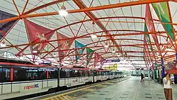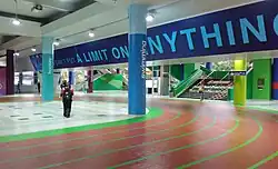 The station originally featured a similar design and ambience with other LRT stations, with roofs supported by latticed frames, and white plastered walls and pillars. It received a facelift in conjunction with the 2017 SEA Games and the renovation of the National Sports Complex as KL Sports City, being revamped with a sporting theme. The revamp features colourful and vibrant graphics, sports symbolisms, and inspirational quotes installed inside and outside the station, such as on the walls and staircases. The floor itself is painted to emulate a relay track, with the faregates acting as the end/beginning of the painted track.[3]