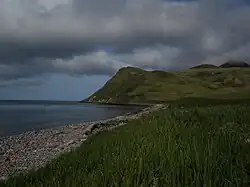 No harbor of any sort occurs on Buldir Island. The coast is mostly steep cliffs or boulder beaches backed by cliffs. Only one small flat area abuts a relatively gentle beach, North Bight Beach, suitable for landing small boats in good weather. It is on the northwest shore of the island.[4] This area is the site of both prehistoric and modern habitation on the island.