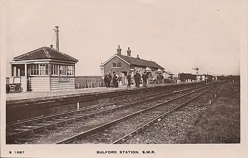 Bulford was the terminus of the public passenger service; trains which continued beyond it were exclusively for military purposes. It had a single concrete-faced platform on the down side of the line, with a run-around loop and a substantial station building built from brick and timber. At some point in later years, the building was fitted with a large wooden awning which covered the platform in front of it. The station had a small signal box, though this was reduced to a ground frame in 1935. There were sidings and a large goods yard.[3]