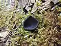 The cap is generally between 0.5 and 4 centimetres (1⁄4 and 1+1⁄2 in) wide and 1 cm tall. It has a dark top with a brown outer surface when young, later becoming more cupped with the black top widening over much of the exterior surface.[3][4] The texture of the mushroom is similar to leather or elastic, depending on dry weather (elastic like), or wet weather (leather).[3]