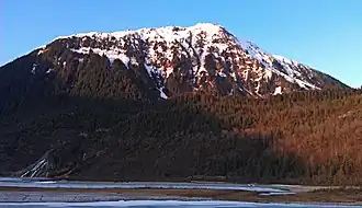 Bullard Mountain is a 4,225-foot (1,288 m) mountain summit located in the Boundary Ranges, in the U.S. state of Alaska.[3] The peak is situated immediately east of the terminus of Mendenhall Glacier, within Tongass National Forest, 9 mi (14 km) north-northwest of Juneau, and 6 mi (10 km) northeast of Juneau International Airport. McGinnis Mountain lies 3.7 mi (6 km) on the opposite side of the glacier, and Heintzleman Ridge lies 2.75 mi (4 km) to the south. Bullard Mountain is often seen and photographed with Mount Wrather, a 5,968-foot (1,819 m) summit 3.9 mi (6 km) to the north because they are together in the background behind Mendenhall Lake, a popular tourist and recreation area. Although modest in elevation, relief is significant since the mountain rises from this nearly sea-level lake in less than two miles. Precipitation runoff from the mountain drains into the lake via Nugget Creek and Nugget Falls. Bullard Mountain is named for Benjamin Bullard (1848-1933), a mining engineer who, in 1907, began mining on Nugget Creek where he later built a hydroelectric power plant.[4]