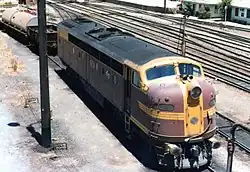 "Bulldog nose" is the nickname given, due to their appearance, to several cab-unit diesel-electric locomotives manufactured by GM-EMD and its licensees from 1939 to 1970. The term originated with EMD F-units, as well as later E-unit models such as the E7, E8, and E9. The bulldog nose design, which has been described as a "cultural icon", consists of two narrow front cab windows, swept back above a protruding nose section, usually with a prominent nose-top mounted headlight. This bore resemblance to a dog's face. It was a blunter and more vertical variation of the early "slant nose" style, which featured a more sloped front and often less protruding headlight. Examples of this included the EMC E1.[1]