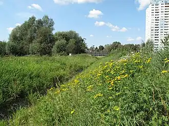 In the Staakener fields, the Bullengraben flowed parallel to the inner-German border of Staaken, which was divided between 1951 and 1990, on West Berlin territory. The ditch was entirely overgrown and its lower regions were neglected during the 1980s and 1990s.[18] After the reunification of Germany, additional urban neighborhoods were linked to the Bullengraben drainage network.