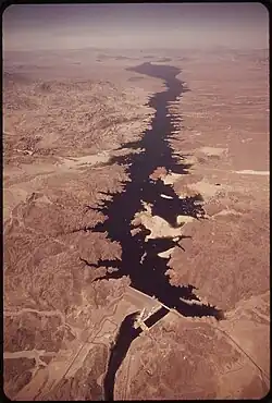 Davis Dam is a zoned earth-fill dam with a concrete spillway, 1,600 ft (490 m) in length at the crest, and 200 ft (61 m) high.[1] The earth fill dam begins on the Nevada side, but it does not extend to the Arizona side on the east. Instead, there is an inlet formed by earth and concrete, that includes the spillway. The hydroelectric power plant is beside the inlet.