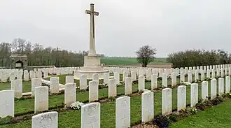 The Bulls Road Cemetery is a military cemetery located in the Somme region of France commemorating British and Commonwealth soldiers who fought in the Battle of the Somme in World War I. The cemetery contains mostly those who died manning the front line near the village of Flers between September 1916 and March 1917 and between March 1918 and September 1918. The cemetery is managed by the Commonwealth War Graves Commission.[1][2]
