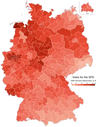The 1998 German federal election was held in Germany on 27 September 1998 to elect the members of the 14th Bundestag. The Social Democratic Party (SPD) emerged as the largest faction in parliament for the first time since 1972, with its leader Gerhard Schröder becoming chancellor. The Christian Democrats had their worst election result since 1949.[1]