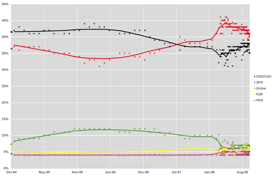The 1998 German election was historic in many ways. It resulted in a centre-right government being succeeded by a left-wing one—the first in postwar Germany (the SPD's previous term in government had been at the helm of a centre-left coalition).