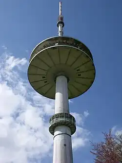 The tower, which belongs to Deutsche Telekom, is used for directional radio links, FM radio and television transmissions (see the list of frequencies below) and mobile telephony services. Constructed of concrete, weighing some 6000 tonnes, and having a diameter at its base of 8.4 metres, the tower is equipped with a public observation deck at a height of 40 metres, accessible by an internal staircase.